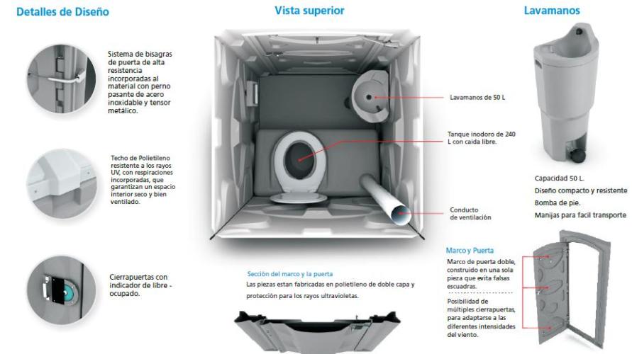 Un baño químico es un sistema totalmente autónomo, que prescinde de conexiones cloacales e instalaciones especiales, que por sus características de construcción es portable y totalmente desarmable de manera de poder colocarlo en los lugares más inaccesibles, como ser la sala de máquinas, bauleras, cocheras, terrazas, etc., que por el material con que están construidos los hace aptos para su uso al aire libre.