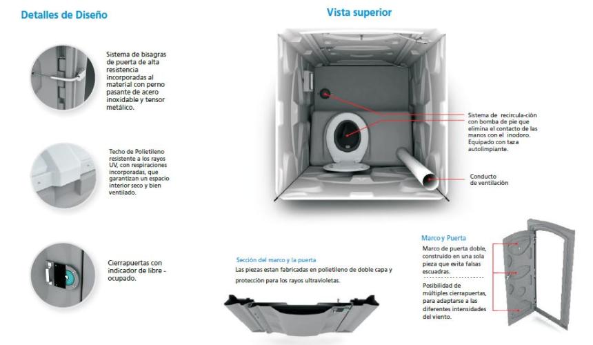 Un baño químico es un sistema totalmente autónomo, que prescinde de conexiones cloacales e instalaciones especiales, que por sus características de construcción es portable y totalmente desarmable de manera de poder colocarlo en los lugares más inaccesibles, como ser la sala de máquinas, bauleras, cocheras, terrazas, etc., que por el material con que están construidos los hace aptos para su uso al aire libre.